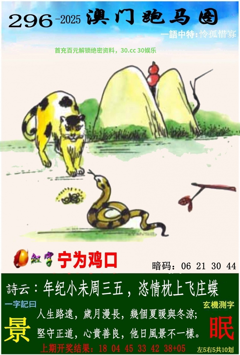 296期一字記曰:【景】 人生路遠,歲月漫長,幾個夏暖與冬涼;堅守正道,心貴善良,他日風景不一樣。【眠】 解:他日风景不一样:他日解日肖兔龙蛇马羊猴 综合取肖:兔龙蛇马羊猴 |